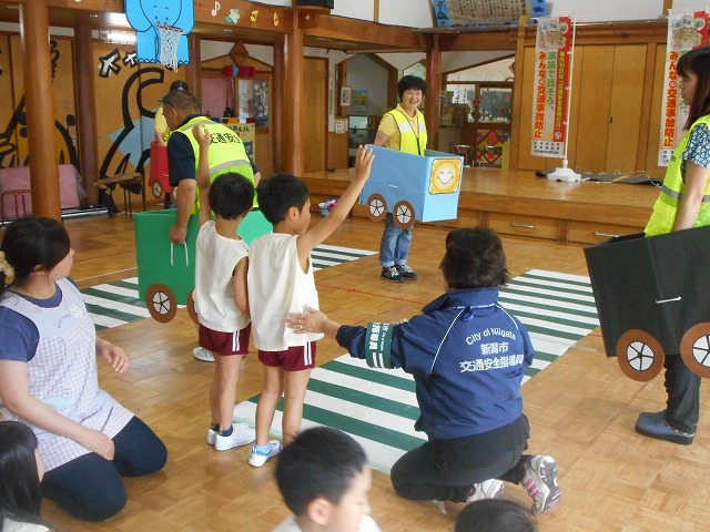 西蒲警察署のおまわりさんのお話を聞いたり、横断歩道の渡り方などの実技指導や、特別ゲストの「けんちゃん」と「おねえさん?」も来てくれて、楽しく交通ルールを学びました。