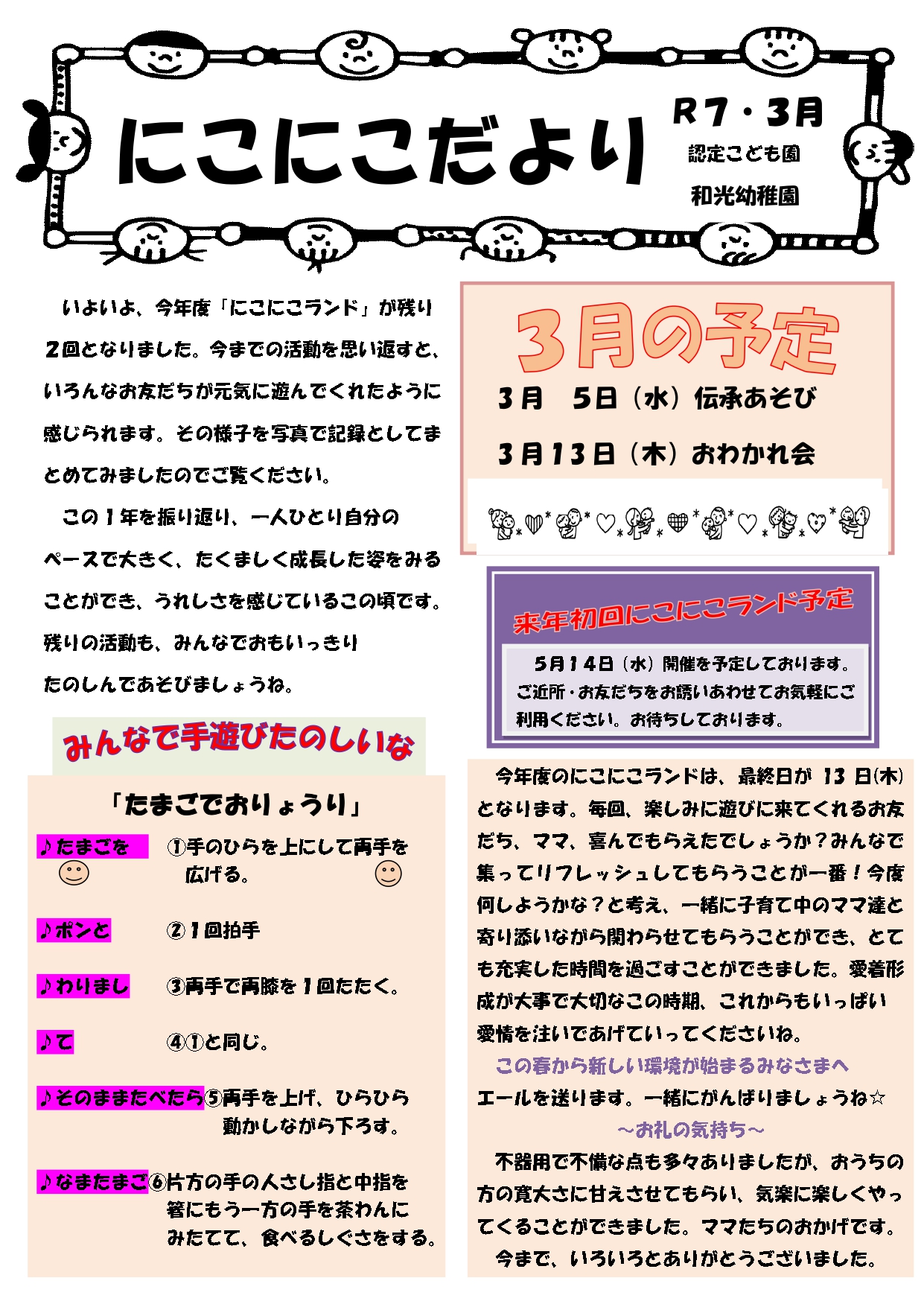 にこにこランドは、幼稚園に入園前のお友達が集まってみんなで歌ったり、紙芝居を見たり、色々な遊びをしたりして楽しむところです。